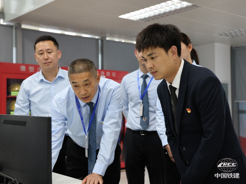 張鑫(右一)檢查高端商寫項目智慧系統(中鐵建物業 供圖)