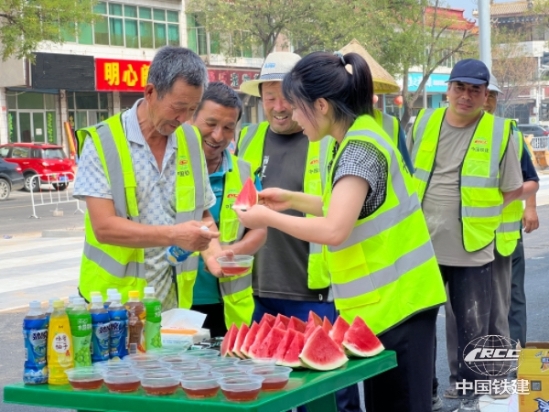 項目將冰鎮飲品、時令水果等送到工友手中(中鐵建設華北公司 供圖)