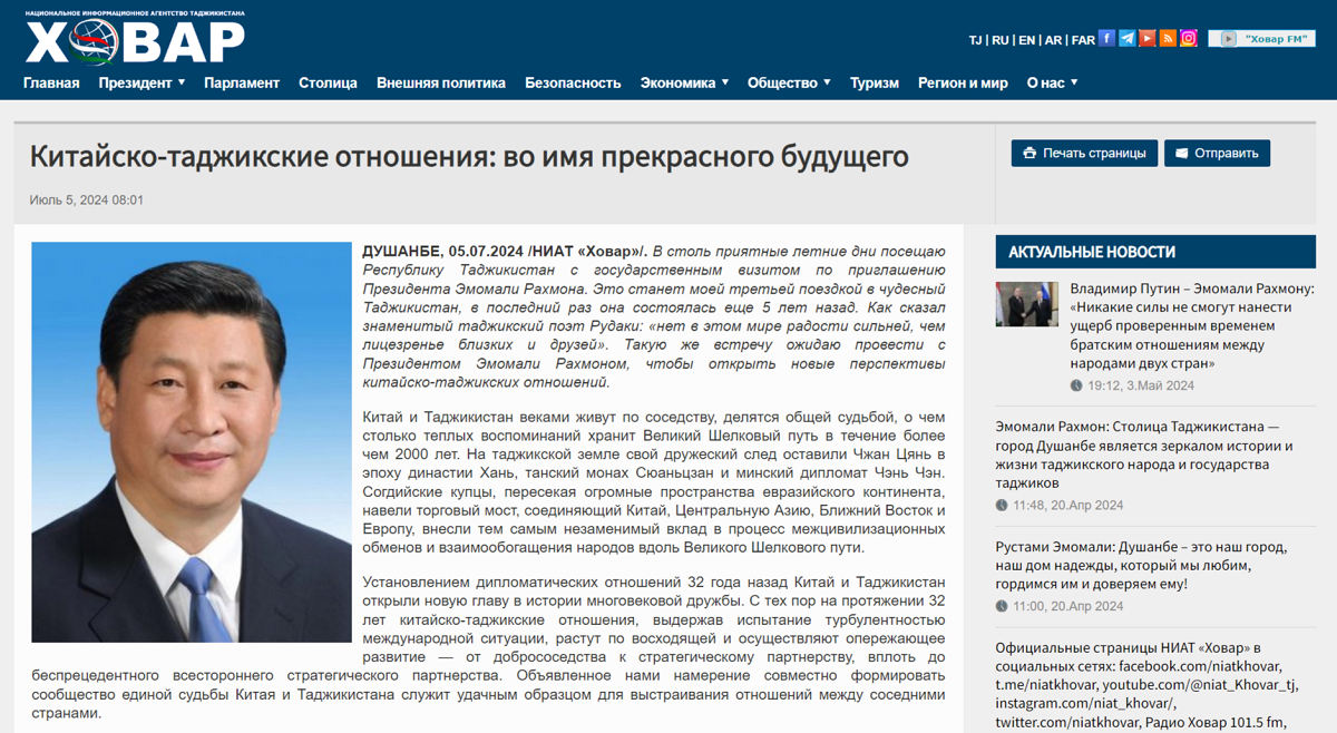 2024年7月5日,在對塔吉克斯坦進行國事訪問之際,國家主席習(xí)近平在塔吉克斯坦《人民報》和“霍瓦爾”國家通訊社發(fā)表題為《共創(chuàng)中塔關(guān)系美好明天》的署名文章。