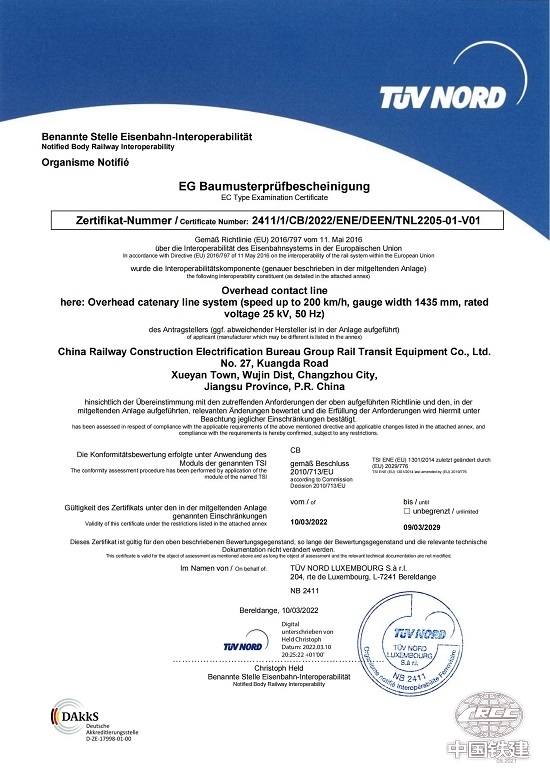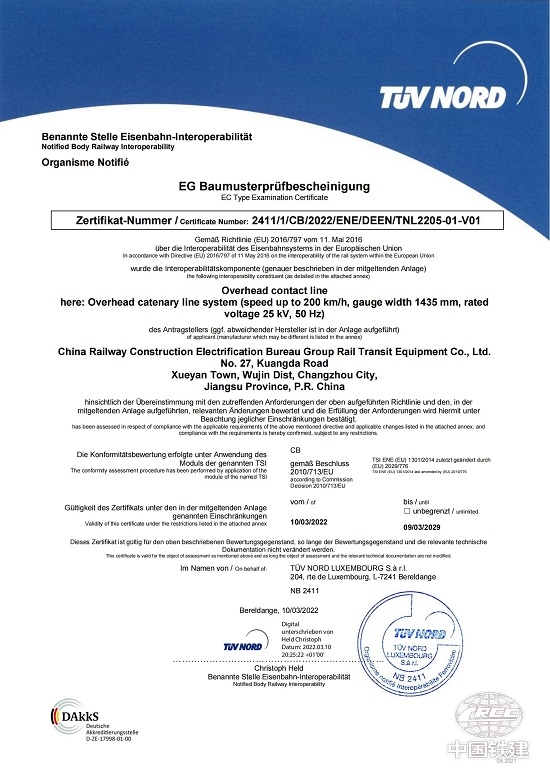 目前“CRCEB”系列產品已在全國200余條高速鐵路項目,以及國內80余條城市軌道線路應用。海外市場也實現了從無到有的突破,先后為匈塞鐵路、中老鐵路、墨西哥瓜達拉哈拉4號線、哥倫比亞波哥大輕軌等多條線路提供優質產品。自2014年起,相繼通過ISO3834焊接管理體系認證及鋼結構EN1090認證,取得了電力牽引架空接觸網(OCL)歐盟鐵路互聯互通(TSI)認證證書,確定了“CRCEB”品牌在高鐵接觸網零部件行業處于國際先進水平。